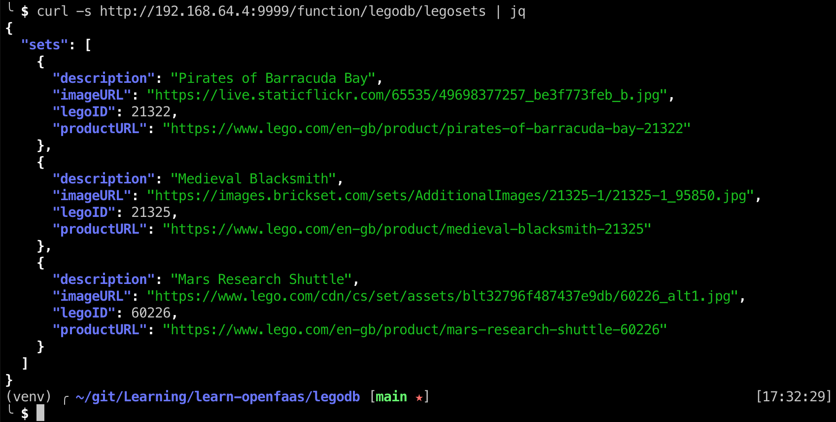 $ curl -s -H "Content-Type: application/json" -d '{"legoID":6929,"description":"Star Fleet Voyager","productURL":"https://brickset.com/sets/6929-1/Star-Fleet-Voyager","imageURL":"https://images.brickset.com/sets/images/6929-1.jpg"}' "http://192.168.64.4:9999/function/legodb/legoset" | jq