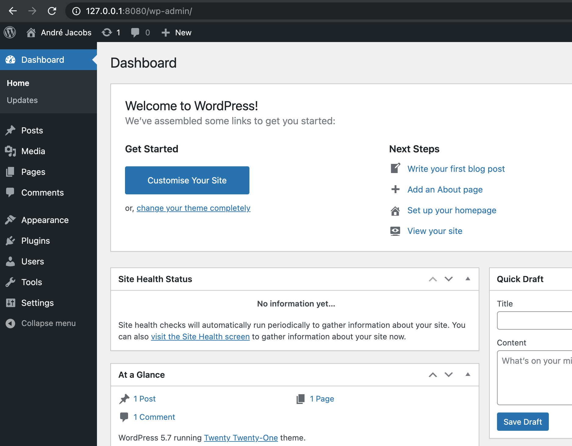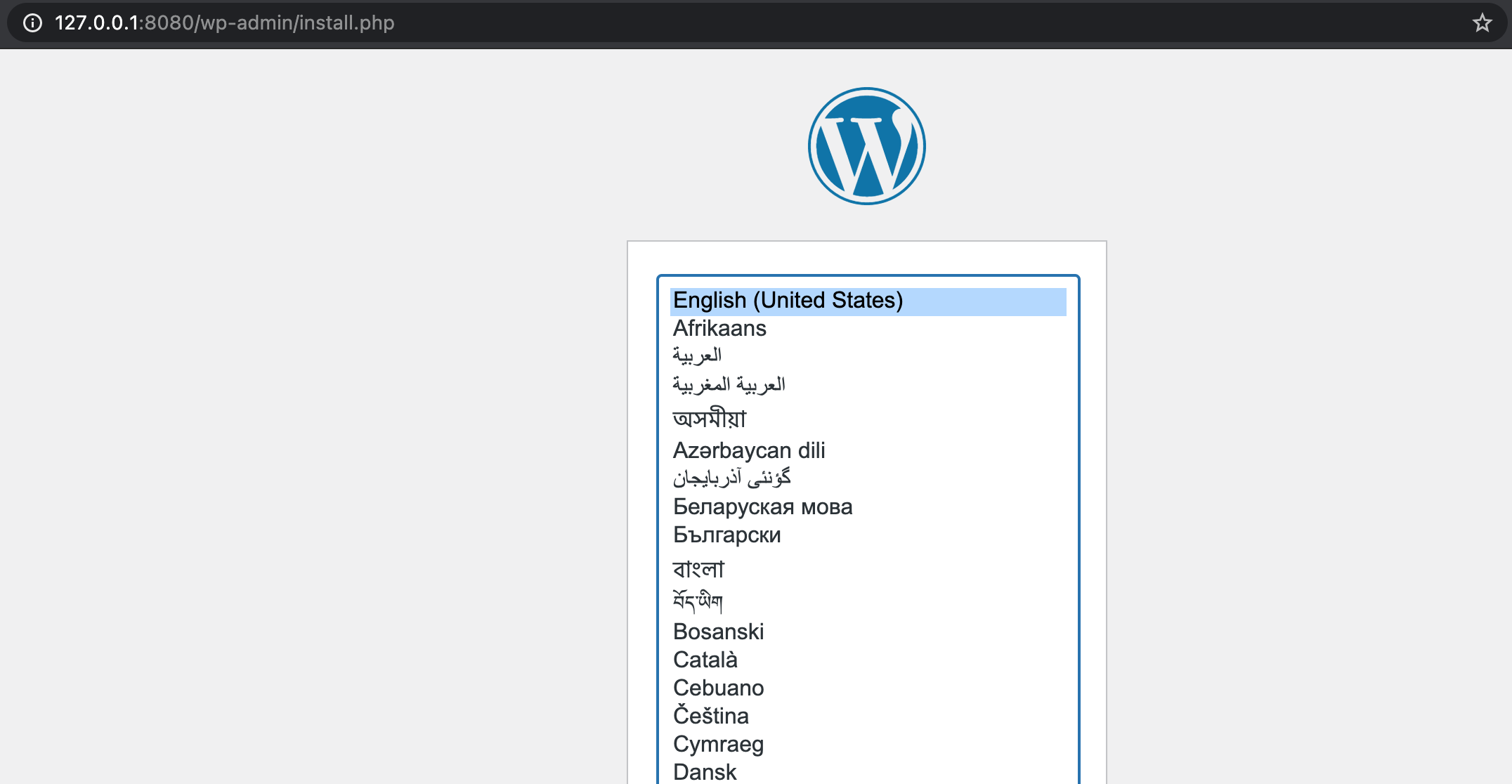 Go grab a coffee and wait for the wordpress installation files to be created. Then $ open http://127.0.0.1:8080
