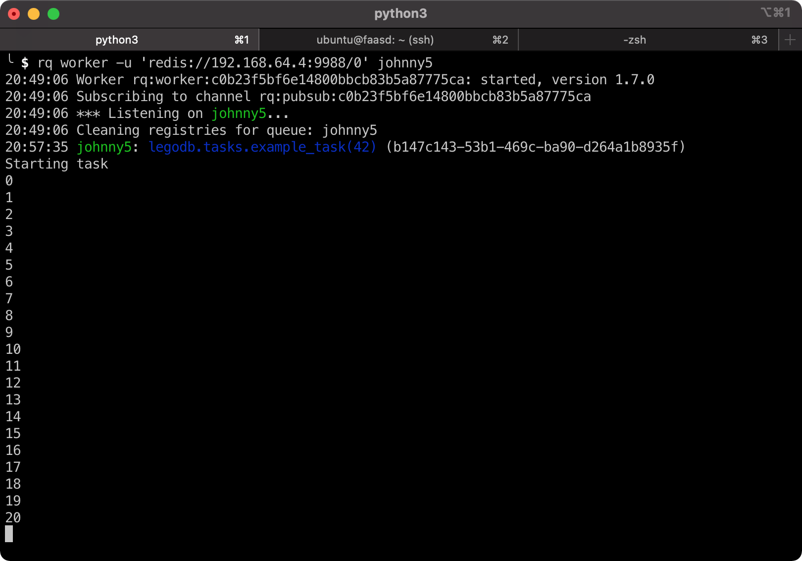 (venv)$ rq worker -u 'redis://192.168.64.4:9988/0' johnny5