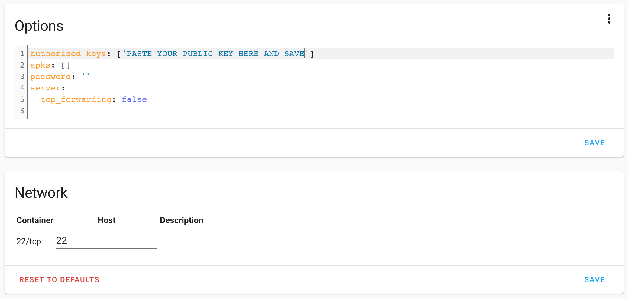 Add the public key to the authorized_keys section and save. To expose the port from the docker container to the host OS enter a port number in the Network section and save.